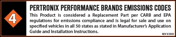 4 - This Product is considered a Replacement Part per CARB and EPA regulations for emissions compliance and is legal for sale and use on specified vehicles in all 50 states as stated in Manufacturer’s Application Guide and Installation Instructions. |